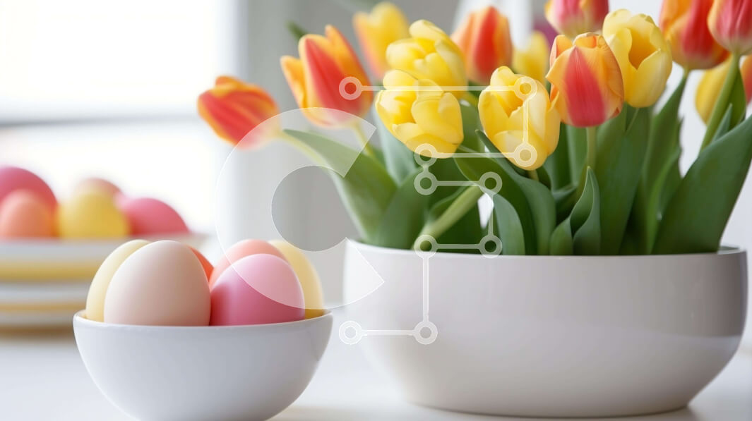 Intra Συλλεκτικό Ξύλινο Παζλ Plywood 4mm - Πολύχρωμα Πασχαλινά αυγά και τουλίπες σε ένα άσπρο μπολ Σε Ξύλινο Κουτί - Διαστάσεις: 10x10 cm – 25 κομμάτια