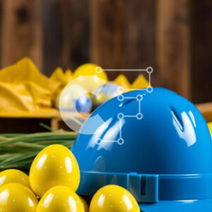 Intra Συλλεκτικό Ξύλινο Παζλ Plywood 4mm - Πολύχρωμο Πασχαλινό εορτασμό με μπλε σκληρό καπέλο και κίτρινα αυγά Σε Ξύλινο Κουτί - Διαστάσεις: 10x10 cm – 25 κομμάτια