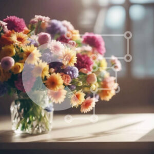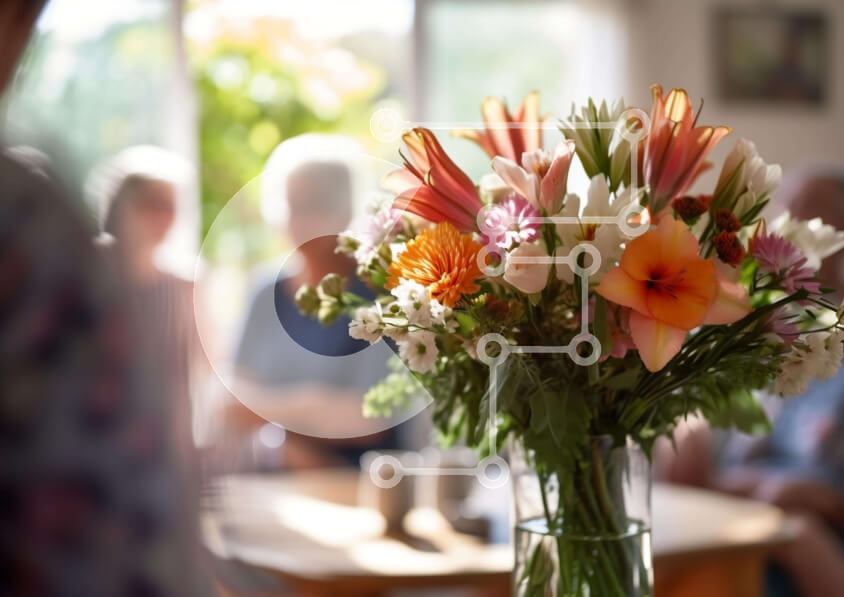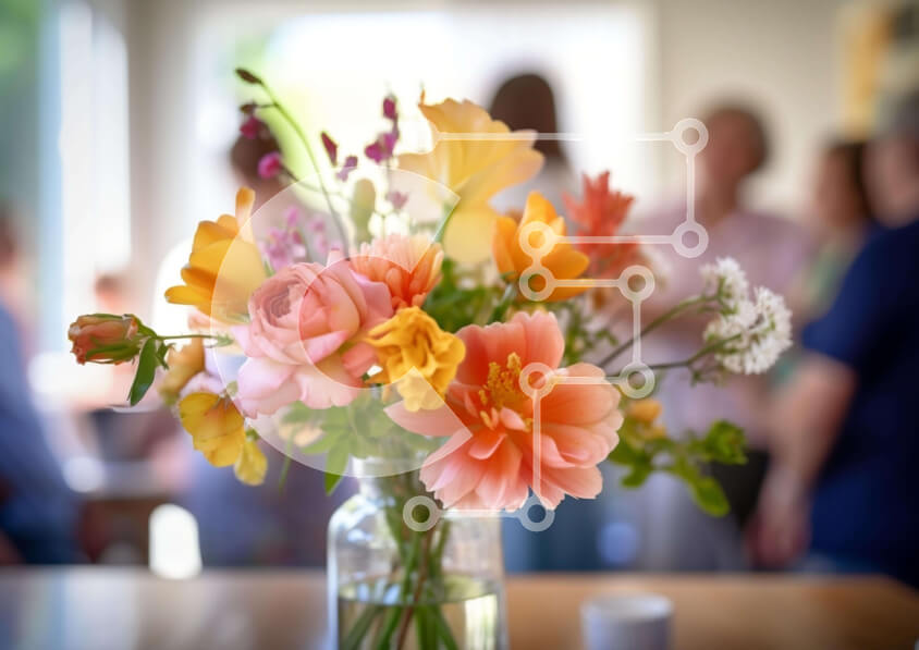 Intra Συλλεκτικό Ξύλινο Παζλ Plywood 4mm - Πολύχρωμο βάζο λουλουδιών σε τραπέζι φαγητού με ανθρώπους Σε Ξύλινο Κουτί - Διαστάσεις Puzzle: 10x10 cm – 25 κομμάτια