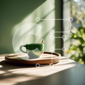 Intra Συλλεκτικό Ξύλινο Παζλ Plywood 4mm - Πράσινο φλιτζάνι καφέ στο δίσκο μπροστά από το ανοιχτό παράθυρο Σε Ξύλινο Κουτί - Διαστάσεις: 10x10 cm – 25 κομμάτια