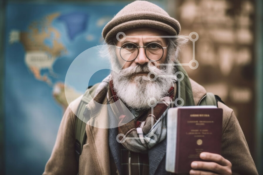 Intra Συλλεκτικό Ξύλινο Παζλ Plywood 4mm - Πορτρέτο ενός ηλικιωμένου άνδρα που κρατά διαβατήριο μπροστά από τον παγκόσμιο χάρτη Σε Ξύλινο Κουτί - Διαστάσεις Puzzle: 10x10 cm – 25 κομμάτια