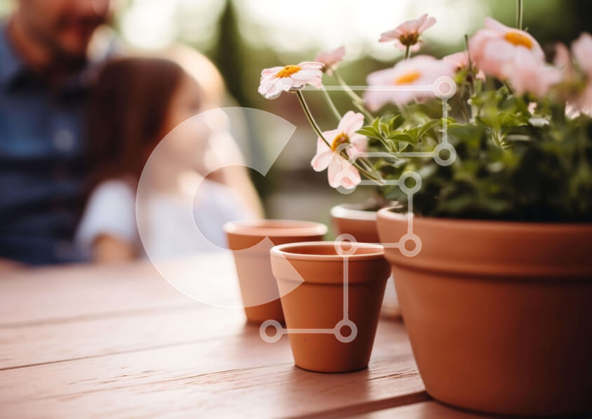 Intra Συλλεκτικό Ξύλινο Παζλ Plywood 4mm - Σκηνή κήπου με ξύλινο τραπέζι, λουλούδια σε γλάστρες και ανθρώπους Σε Ξύλινο Κουτί - Διαστάσεις Puzzle: 10x10 cm – 25 κομμάτια