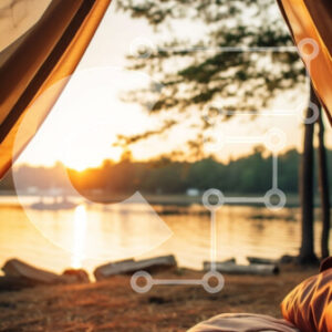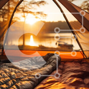 Intra Συλλεκτικό Ξύλινο Παζλ Plywood 4mm - Σκηνή με ανοιχτό πτερύγιο σε μια χλοώδη περιοχή δίπλα στο νερό Σε Ξύλινο Κουτί - Διαστάσεις: 10x10 cm – 25 κομμάτια