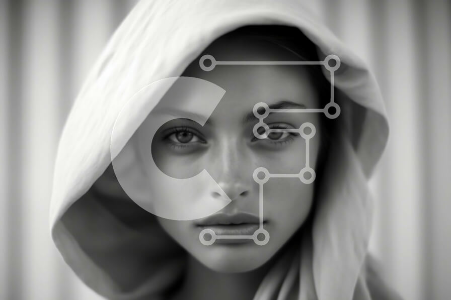 Intra Συλλεκτικό Ξύλινο Παζλ Plywood 4mm - Σοβαρή γυναίκα με λευκό κουκούλα που κοιτάζει κατευθείαν την κάμερα Σε Ξύλινο Κουτί - Διαστάσεις Puzzle: 10x10 cm – 25 κομμάτια