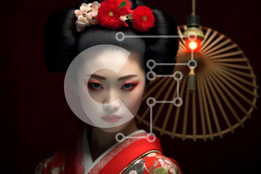 Intra Συλλεκτικό Ξύλινο Παζλ Plywood 4mm - Σοβαρή γυναίκα με κόκκινο κιμονό με βεντάλια και λουλούδι στα μαλλιά Σε Ξύλινο Κουτί - Διαστάσεις Puzzle: 10x10 cm – 25 κομμάτια