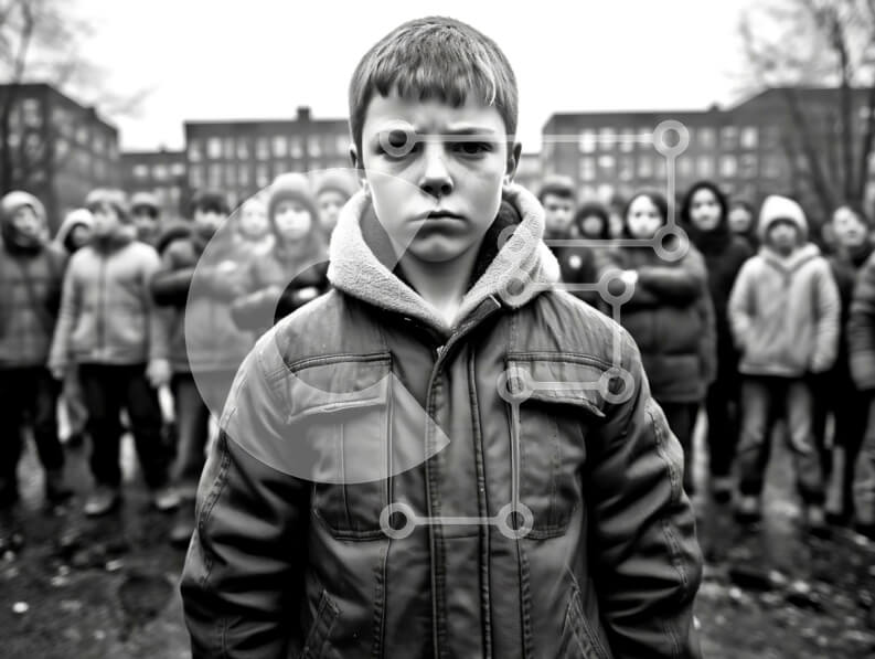 Intra Συλλεκτικό Ξύλινο Παζλ Plywood 4mm - Σοβαρή εικόνα του νεαρού αγοριού με μαύρο κουκούλα που στέκεται μπροστά από μια ομάδα ανθρώπων Σε Ξύλινο Κουτί - Διαστάσεις Puzzle: 10x10 cm – 25 κομμάτια