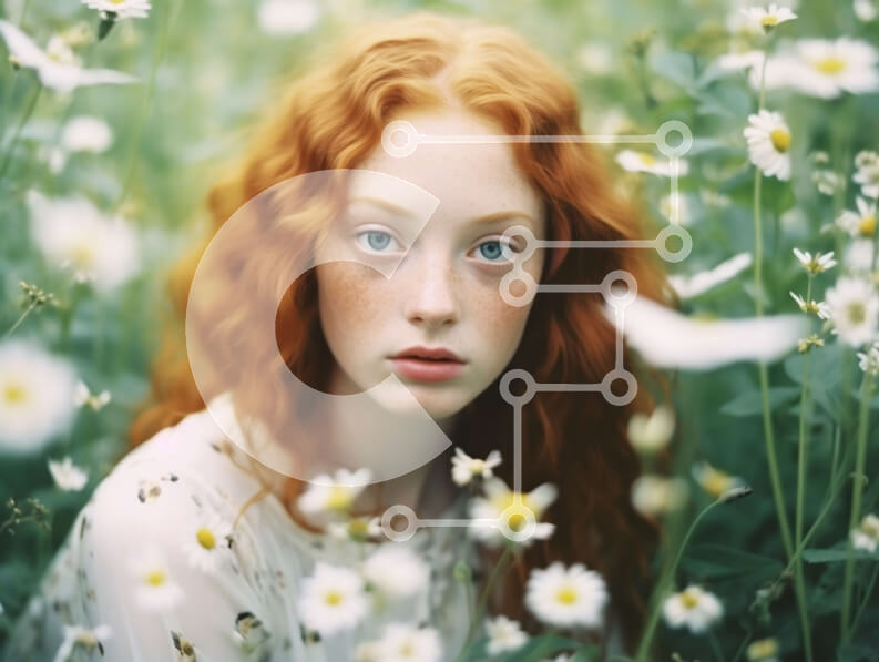 Intra Συλλεκτικό Ξύλινο Παζλ Plywood 4mm - Σοβαρή εμφάνιση κοκκινομάλλα σε ένα χωράφι με λευκά λουλούδια Σε Ξύλινο Κουτί - Διαστάσεις Puzzle: 10x10 cm – 25 κομμάτια