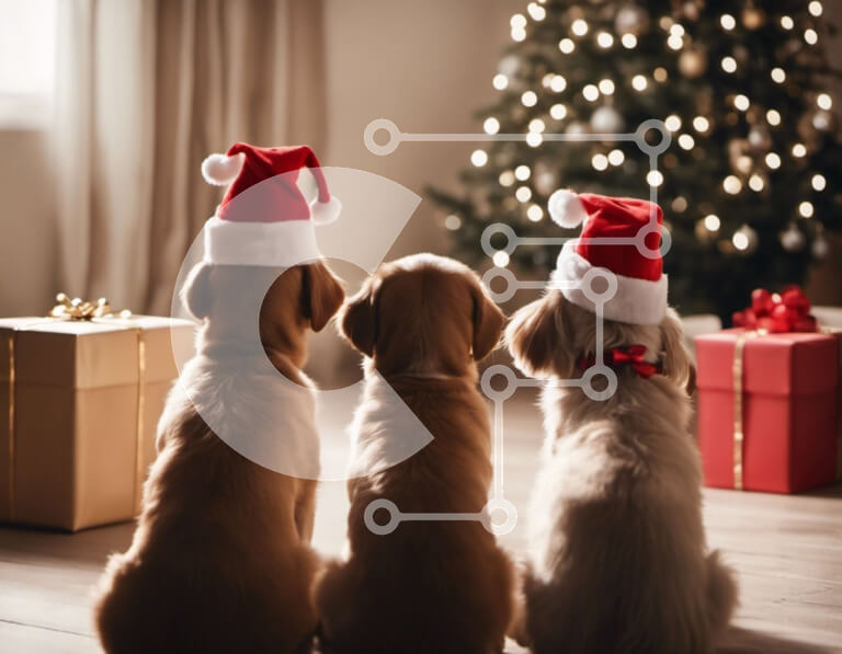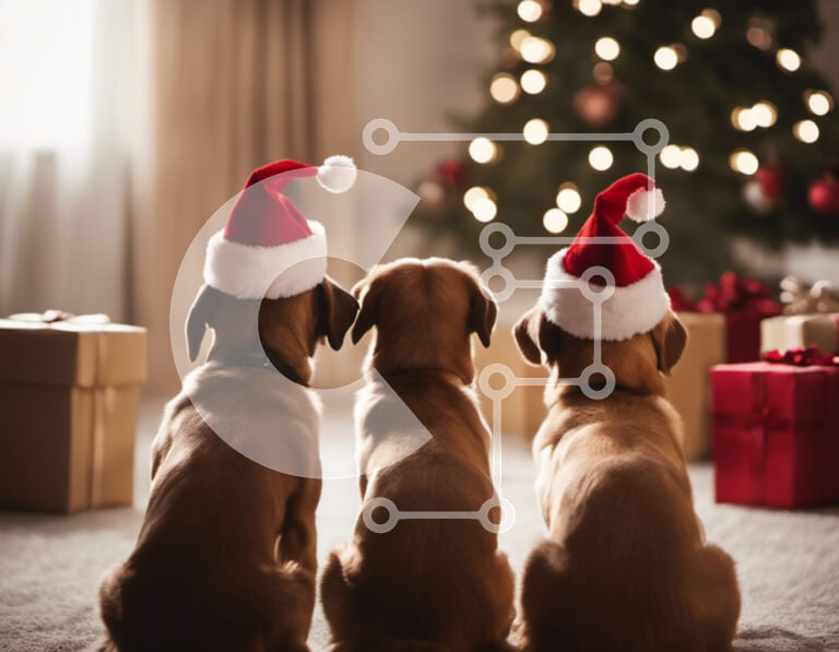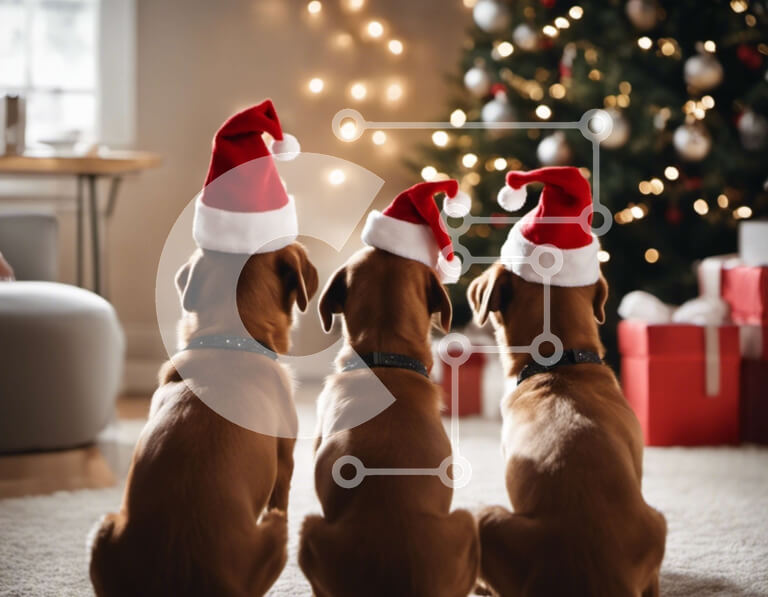 Intra Συλλεκτικό Ξύλινο Παζλ Plywood 4mm - Τρία σκυλιά με καπέλα Άγιου Βασίλη που κάθονται μπροστά από ένα στολισμένο χριστουγεννιάτικο δέντρο Σε Ξύλινο Κουτί - Διαστάσεις: 10x10 cm – 25 κομμάτια