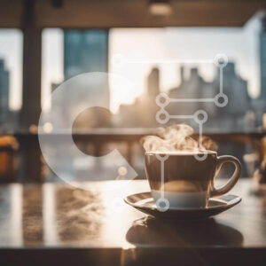 Intra Συλλεκτικό Ξύλινο Παζλ Plywood 4mm - Φλιτζάνι καφέ στο τραπέζι με τον ορίζοντα της πόλης στο φόντο Σε Ξύλινο Κουτί - Διαστάσεις: 10x10 cm – 25 κομμάτια