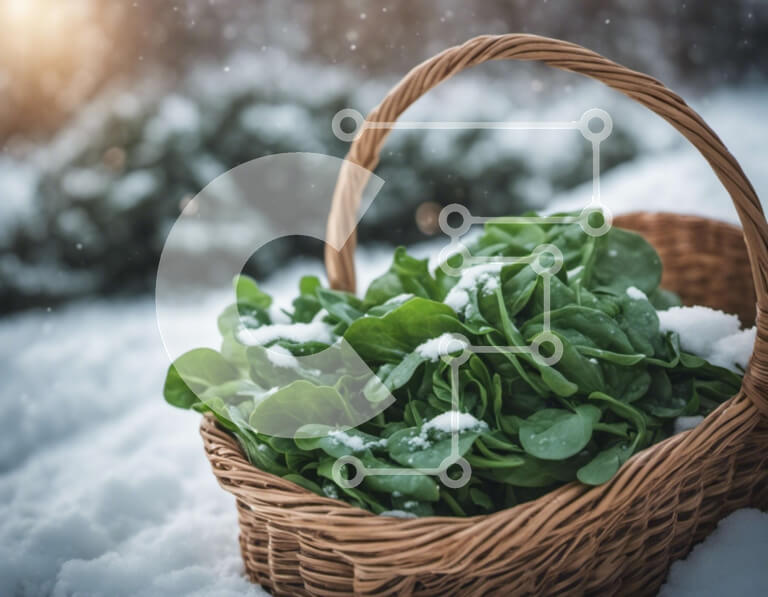 Intra Συλλεκτικό Ξύλινο Παζλ Plywood 4mm - Φρέσκο σπανάκι σε ψάθινο καλάθι σε χιονισμένο έδαφος Σε Ξύλινο Κουτί - Διαστάσεις: 10x10 cm – 25 κομμάτια