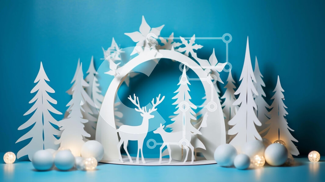 Intra Συλλεκτικό Ξύλινο Παζλ Plywood 4mm - Χαρτί κομμένα ελάφια και πεύκα στο δάσος με φώτα και στολίδια Σε Ξύλινο Κουτί - Διαστάσεις: 10x10 cm – 25 κομμάτια