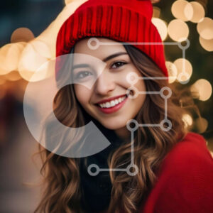 Intra Συλλεκτικό Ξύλινο Παζλ Plywood 4mm - Χαμογελαστή γυναίκα στα κόκκινα με μακριά σγουρά μαλλιά μπροστά από ένα φωτισμένο χριστουγεννιάτικο δέντρο Σε Ξύλινο Κουτί - Διαστάσεις: 10x10 cm – 25 κομμάτια