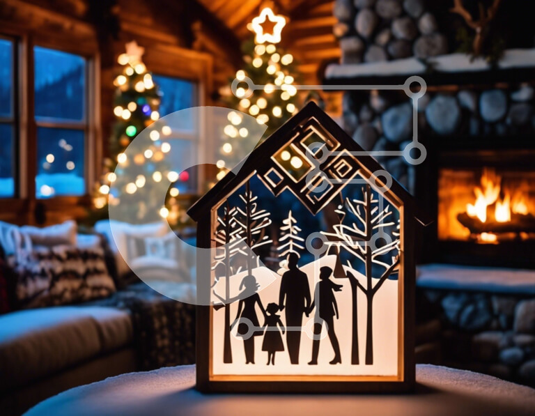 Intra Συλλεκτικό Ξύλινο Παζλ Plywood 4mm - Χάρτινο φανάρι σε σχήμα σπιτιού με οικογενειακές σιλουέτες δίπλα στο τζάκι Σε Ξύλινο Κουτί - Διαστάσεις: 10x10 cm – 25 κομμάτια