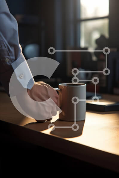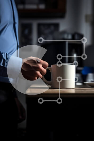 Intra Συλλεκτικό Ξύλινο Παζλ Plywood 4mm - Χέρι που κρατά μια λευκή κούπα καφέ σε ένα ζεστό περιβάλλον κουζίνας Σε Ξύλινο Κουτί - Διαστάσεις Puzzle: 10x10 cm – 25 κομμάτια