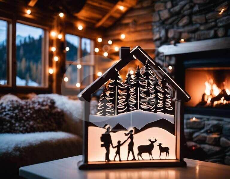 Intra Συλλεκτικό Ξύλινο Παζλ Plywood 4mm - Φωτεινό γλυπτό σε σχήμα σπιτιού με ανθρώπους και σιλουέτες ελαφιών Σε Ξύλινο Κουτί - Διαστάσεις Puzzle: 10x10 cm – 25 κομμάτια