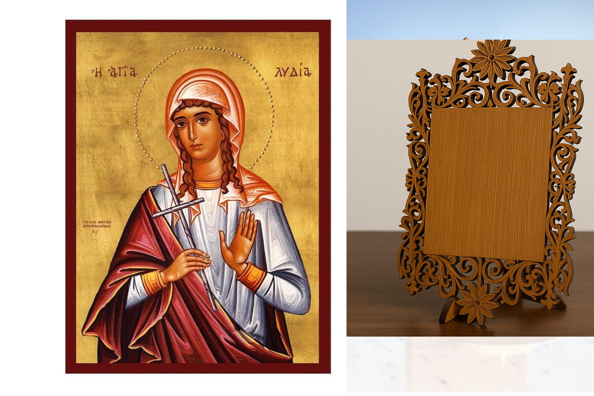 Εικόνα Ορθοδοξίας Δαντέλα μαζι με Βάση σε 8 χρώματα με περίγραμμα χρυσό σε ξύλο Plywood (Πλακάζ) με βάση Εικόνα Αγίας Λυδίας, Χειροποίητη βυζαντινή εικόνα της Αγίας Λυδίας, Πλακέτα θρησκευτικής τέχνης, Χριστιανικό δώρο Διάσταση 21x15 cm (8,3 x 5,9 ίντσες) INTRAEKkadro3211-216723855