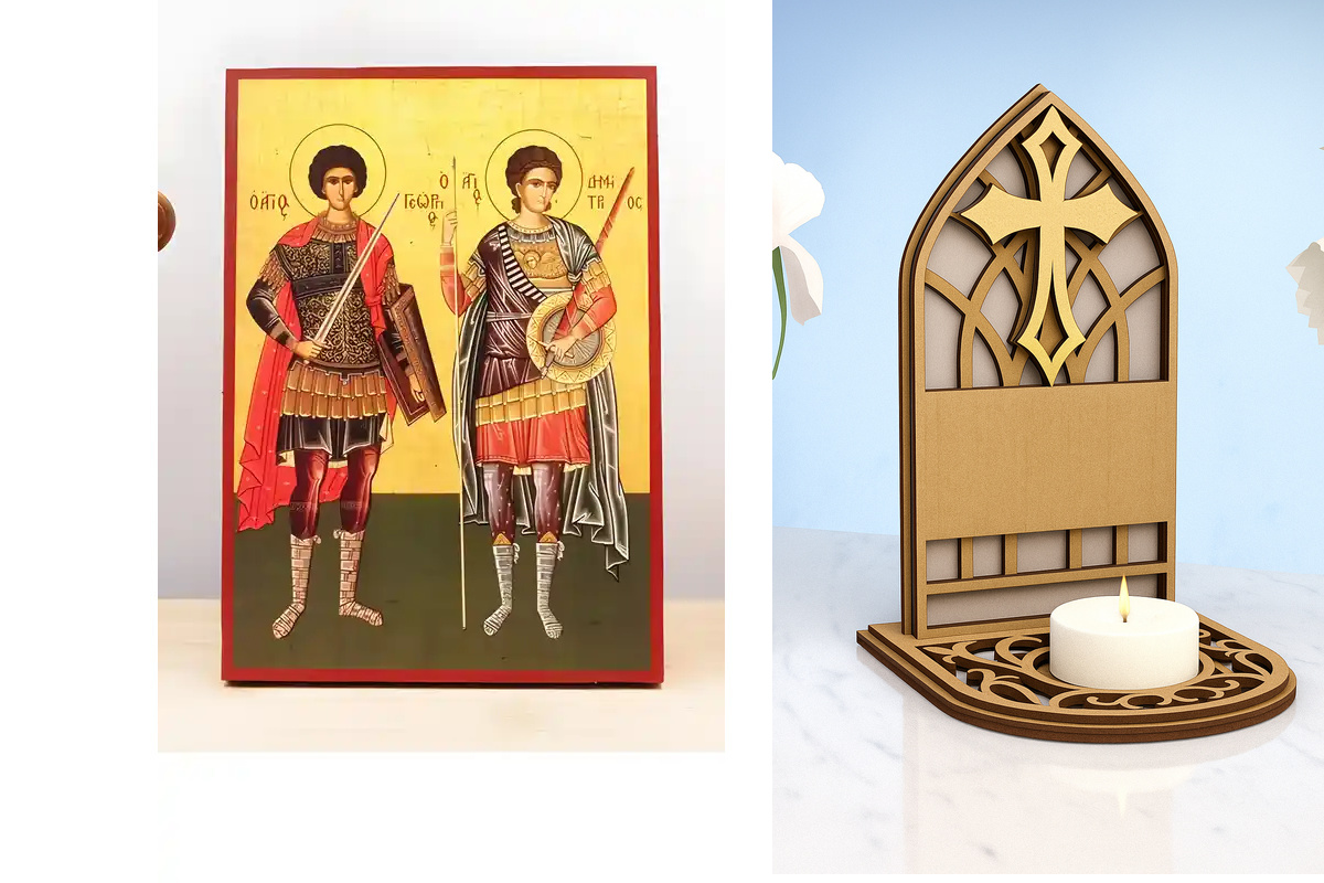 Εικόνα Ορθοδοξίας Καντηλάκι σε 8 χρώματα με περίγραμμα χρυσό σε ξύλο Plywood (Πλακάζ) με βάση Άγιοι Γεώργιος και Δημήτριος, Ξύλινη Χειροποίητη Εικόνα Ελληνικής Premium Βυζαντινού Στυλ Κρεμασμένη σε ξύλινη πλάκα Χειροποίητη Ελληνορθόδοξη εικόνα του Ιησού Χριστού, Κρεμαστή πλάκα βυζαντινής τέχνης, χριστιανική τέχνη Διάσταση 26x20 cm (10,2 x 7,9 ίντσες) INTRAEKkadro1-22611205