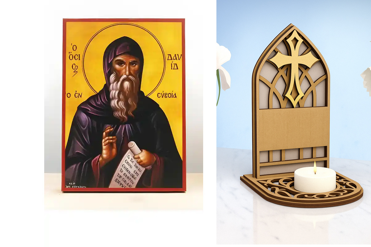 Εικόνα Ορθοδοξίας Καντηλάκι σε 8 χρώματα με περίγραμμα χρυσό σε ξύλο Plywood (Πλακάζ) με βάση Άγιος Δανιήλ Κατουνακιώτης Σμύρνης, Ξύλινη Χειροποίητη Εικόνα Ελληνικού Βυζαντινού Στυλ Κρεμαστή σε ξύλινη πλάκα Θρησκευτικό Θέμα Χειροποίητη Ελληνορθόδοξη εικόνα του Ιησού Χριστού, Κρεμαστή πλάκα βυζαντινής τέχνης, χριστιανική τέχνη Διάσταση 40x30 cm (15,8 x 11,8 ίντσες) INTRAEKkadro1-2111068