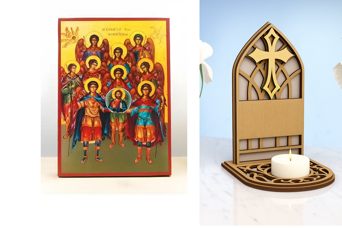 Εικόνα Ορθοδοξίας Καντηλάκι σε 8 χρώματα με περίγραμμα χρυσό σε ξύλο Plywood (Πλακάζ) με βάση Σύναξη Αρχαγγέλων με τον Ιησού Χριστό, Ξύλινη Χειροποίητη Εικόνα Ελληνικού Βυζαντινού Στυλ Κρεμαστή σε Ξύλινη Πλάκα Θρησκευτικό Θέμα Χειροποίητη Ελληνορθόδοξη εικόνα του Ιησού Χριστού, Κρεμαστή πλάκα βυζαντινής τέχνης, χριστιανική τέχνη Διάσταση 10x7 cm (3,9 x 2,8 ίντσες) INTRAEKkadro1-10806