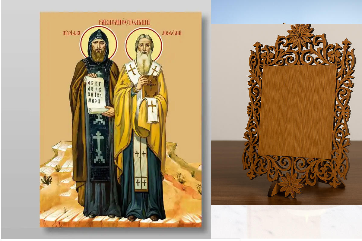 Εικόνα Ορθοδοξίας Δαντέλα μαζι με Βάση σε 8 χρώματα με περίγραμμα χρυσό σε ξύλο Plywood (Πλακάζ) με βάση Κύριλλος και Μεθόδιος, άγιοι, ισάξιοι των αποστόλων, Χειροποίητη Ελληνορθόδοξη , Κρεμαστή πλάκα βυζαντινής τέχνης, χριστιανική τέχνη Διάσταση 50x40 cm (19,7 x 15,8 ίντσες) INTRAEKkadro3211-654321248