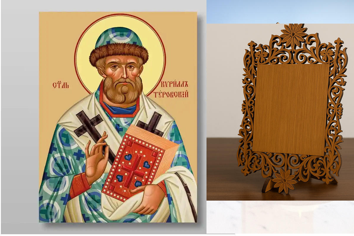 Εικόνα Ορθοδοξίας Δαντέλα μαζι με Βάση σε 8 χρώματα με περίγραμμα χρυσό σε ξύλο Plywood (Πλακάζ) με βάση Κύριλλος του Τουρόφ άγιος, Επίσκοπος, πνευματικός συγγραφέας, ιεροκήρυκας, θεολόγος, υμνογράφος, Χειροποίητη Ελληνορθόδοξη , Κρεμαστή πλάκα βυζαντινής τέχνης, χριστιανική τέχνη Διάσταση 26x20 cm (10,2 x 7,9 ίντσες) INTRAEKkadro3211-4321294