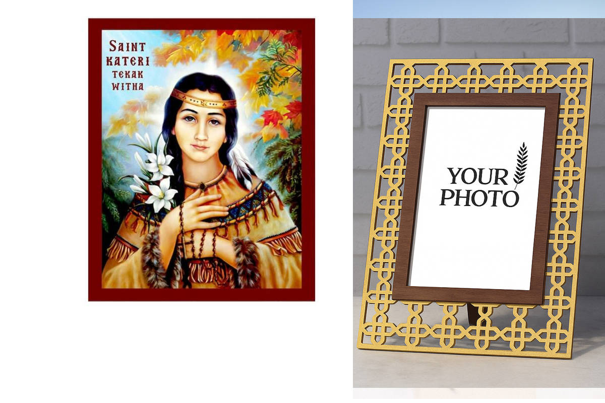 Εικόνα Ορθοδοξίας Πολυτελείας με σχεδιο Σταυρούς μαζι με Βάση σε 8 χρώματα με περίγραμμα χρυσό σε ξύλο Plywood (Πλακάζ) με βάση Εικόνα Santa Kateri Tekakwitha, Χειροποίητη Θρησκευτική Εικόνα Santa Kateri Tekakwitha, Κρεμαστή Πλακέτα Βυζαντινής Τέχνης, Χριστιανική Θρησκευτική Τέχνη Διάσταση 10x7 cm (3,9 x 2,8 ίντσες) INTRAEK3kadro3211-816723815