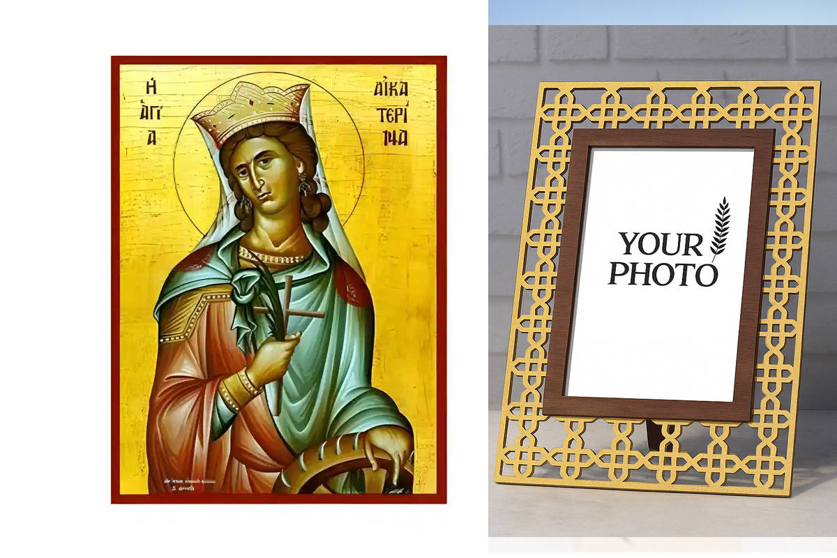 Εικόνα Ορθοδοξίας Πολυτελείας με σχεδιο Σταυρούς μαζι με Βάση σε 8 χρώματα με περίγραμμα χρυσό σε ξύλο Plywood (Πλακάζ) με βάση Εικόνα Αγία Αικατερίνη Χειροποίητη Ελληνορθόδοξη , Κρεμαστή πλάκα βυζαντινής τέχνης, χριστιανική τέχνη Διάσταση 10x7 cm (3,9 x 2,8 ίντσες) INTRAEK3kadro3211-670706