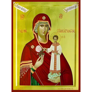 Εικόνα Ορθοδοξίας με περίγραμμα χρυσό σε ξύλο Φλαμουρίας με βάση Εικόνα ΠΑΝΑΓΙΑ ΜΕ ΧΡΙΣΤΟ, ΡΟΔΟ ΤΟ ΑΜΑΡΑΝΤΟ, ΕΝΘΡΟΝΟΣ Χειροποίητη Ελληνορθόδοξη εικόνα του Ιησού Χριστού, Κρεμαστή πλάκα βυζαντινής τέχνης, χριστιανική τέχνη Διάσταση 15x11 cm (5,9x4,3 ίντσες) INTRAEK-337757863828