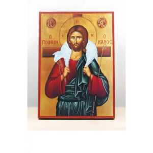 Εικόνα Ορθοδοξίας με περίγραμμα χρυσό σε ξύλο Φλαμουρίας με βάση Ιησούς Χριστός ο καλός Ποιμένας, Ξύλινη Χειροποίητη Εικόνα Ελληνικού Premium Βυζαντινού Στυλ Κρεμασμένο σε ξύλινη πλάκα Θρησκευτικό θέμα Χειροποίητη Ελληνορθόδοξη εικόνα του Ιησού Χριστού, Κρεμαστή πλάκα βυζαντινής τέχνης, χριστιανική τέχνη Διάσταση 15x11 cm (5,9 x 4,3 ίντσες) INTRAEK-611077