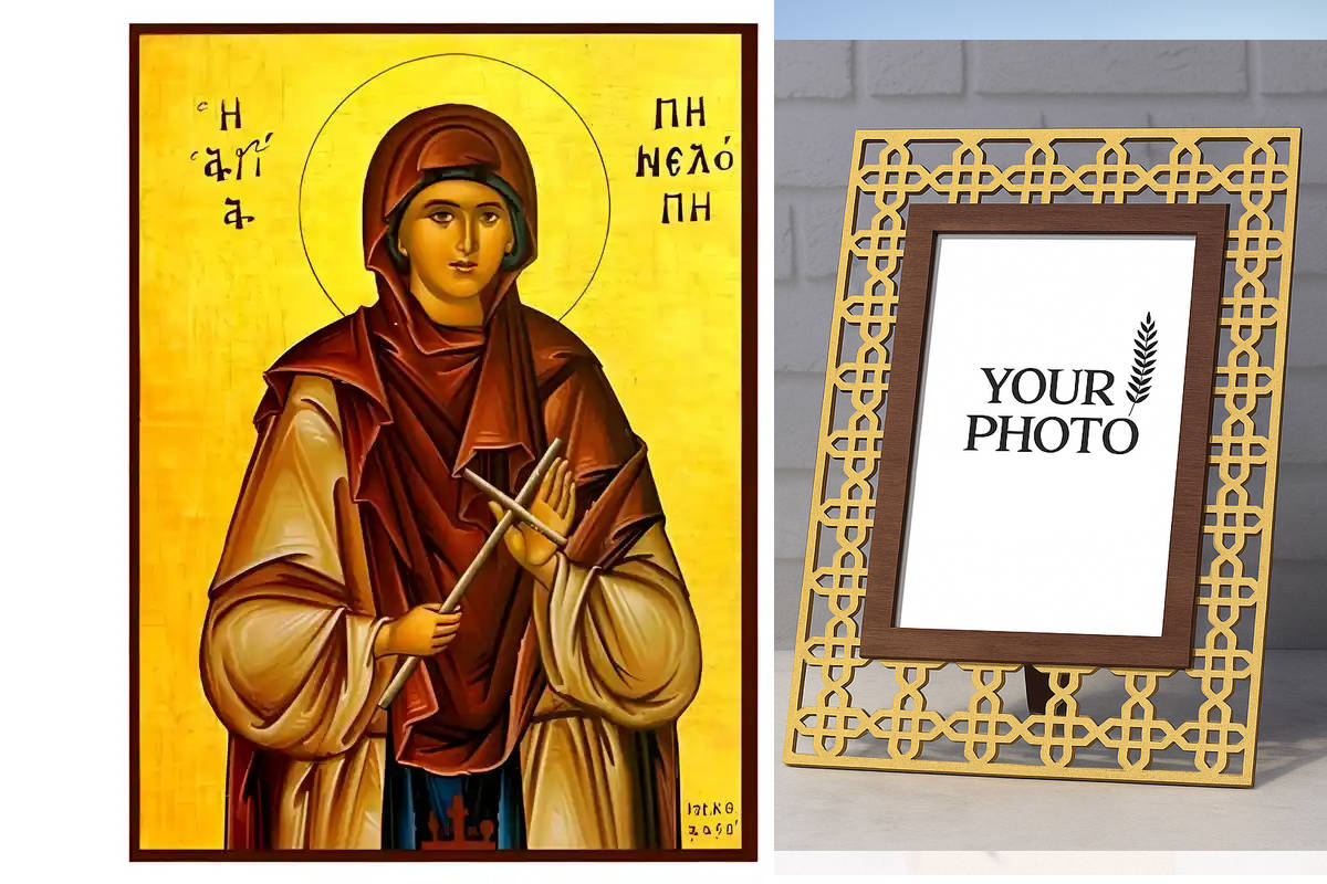 Εικόνα Ορθοδοξίας Πολυτελείας με σχεδιο Σταυρούς μαζι με Βάση σε 8 χρώματα με περίγραμμα χρυσό σε ξύλο Plywood (Πλακάζ) με βάση Εικόνα Αγία Πηνελόπη Χειροποίητη Ελληνορθόδοξη , Κρεμαστή πλάκα βυζαντινής τέχνης, χριστιανική τέχνη Διάσταση 10x7 cm (3,9 x 2,8 ίντσες) INTRAEK3kadro3211-670533