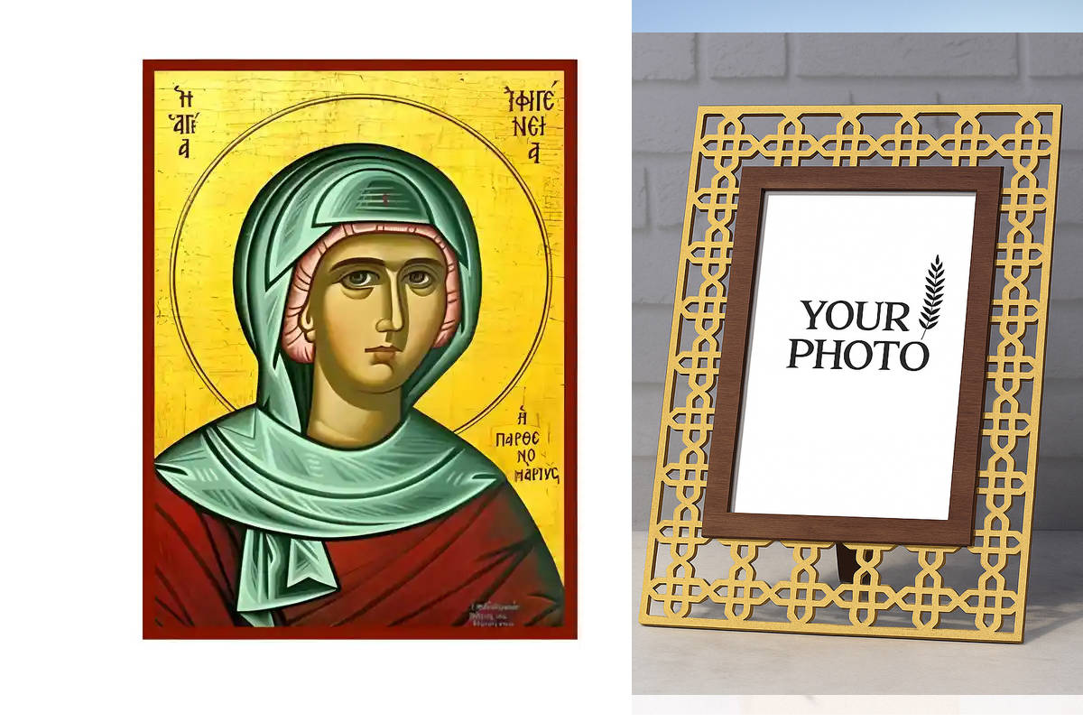 Εικόνα Ορθοδοξίας Πολυτελείας με σχεδιο Σταυρούς μαζι με Βάση σε 8 χρώματα με περίγραμμα χρυσό σε ξύλο Plywood (Πλακάζ) με βάση Εικόνα Αγία Ιφιγένεια Χειροποίητη Ελληνορθόδοξη , Κρεμαστή πλάκα βυζαντινής τέχνης, χριστιανική τέχνη Διάσταση 10x7 cm (3,9 x 2,8 ίντσες) INTRAEK3kadro3211-670604