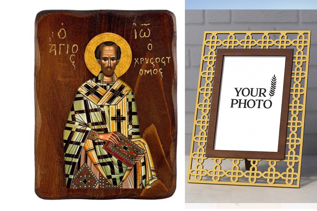 Εικόνα Ορθοδοξίας Πολυτελείας με σχεδιο Σταυρούς μαζι με Βάση σε 8 χρώματα με περίγραμμα χρυσό σε ξύλο Plywood (Πλακάζ) με βάση Εικόνα Αγίου Ιωάννη του Χρυσοστόμου, Χειροποίητη Ελληνορθόδοξη εικόνα του Αγίου Ιωάννη, επιτοίχια πλάκα βυζαντινής τέχνης, θρησκευτικό δώρο, χριστιανική διακόσμηση Διάσταση 21x15 cm (8,3 x 5,9 ίντσες) INTRAEK3kadro3211-216723759