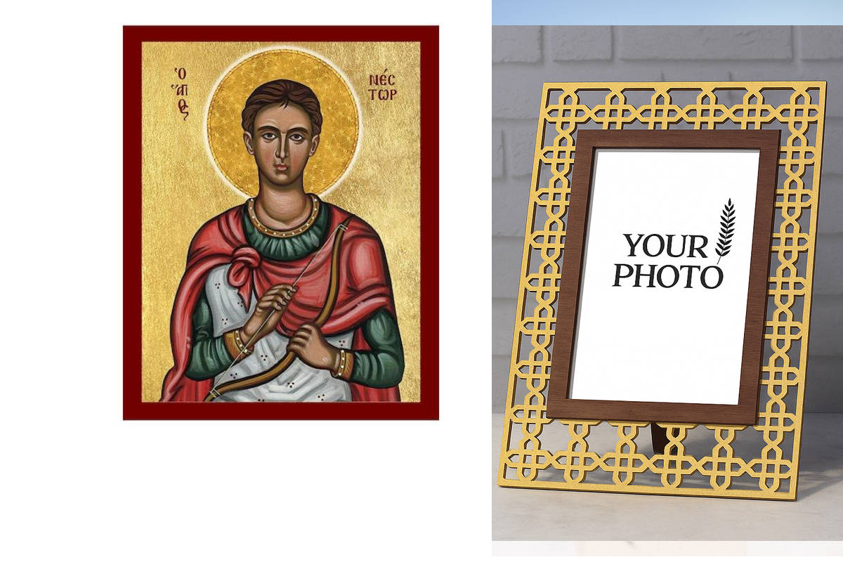 Εικόνα Ορθοδοξίας Πολυτελείας με σχεδιο Σταυρούς μαζι με Βάση σε 8 χρώματα με περίγραμμα χρυσό σε ξύλο Plywood (Πλακάζ) με βάση Εικόνα Αγίου Νέστορα, Χειροποίητη βυζαντινή εικόνα του Αγίου Νέστορα, Πλακέτα θρησκευτικής τέχνης, Χριστιανικό δώρο Διάσταση 21x15 cm (8,3 x 5,9 ίντσες) INTRAEK3kadro3211-216723791