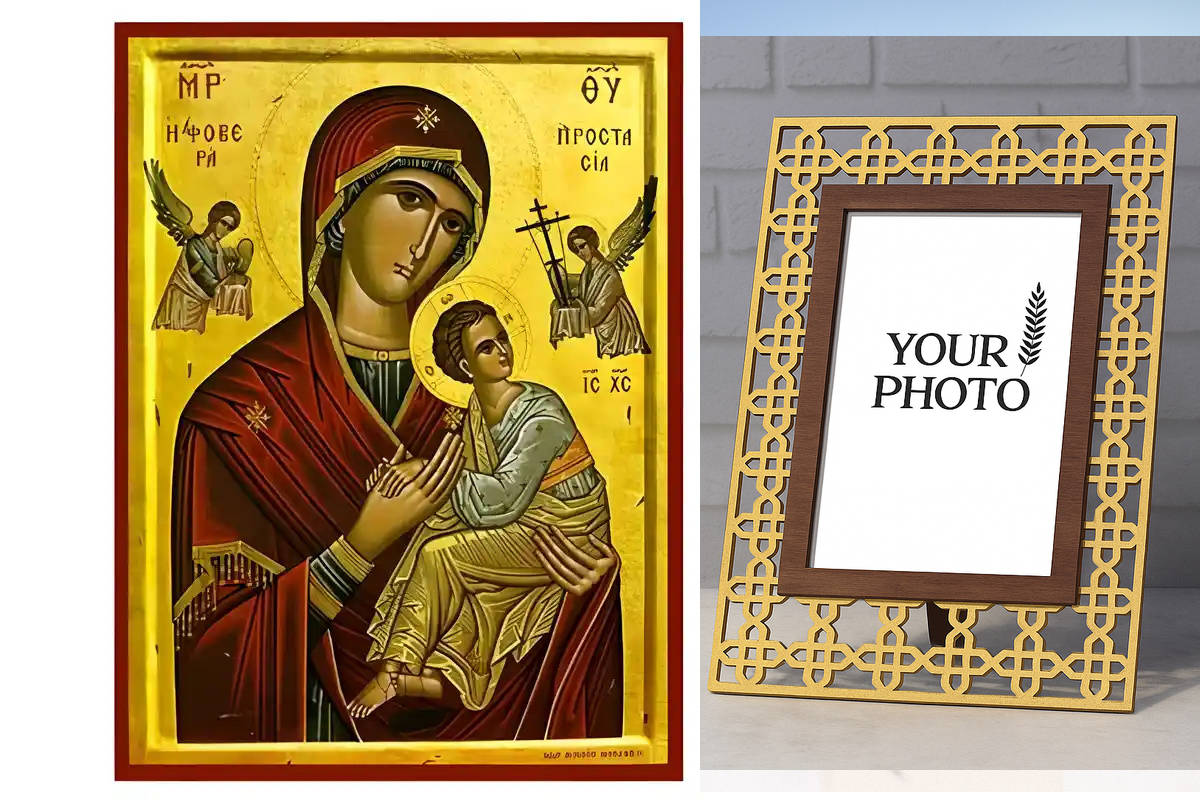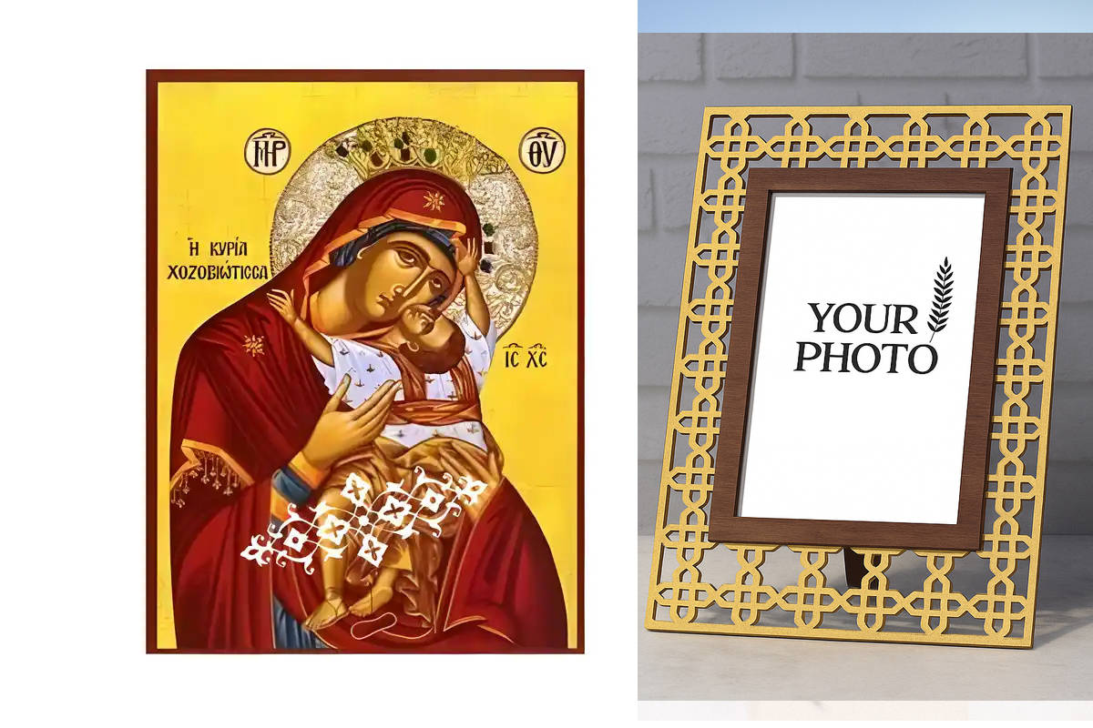 Εικόνα Ορθοδοξίας Πολυτελείας με σχεδιο Σταυρούς μαζι με Βάση σε 8 χρώματα με περίγραμμα χρυσό σε ξύλο Plywood (Πλακάζ) με βάση Εικόνα Παναγία Χοζοβιώτισσα Χειροποίητη Ελληνορθόδοξη , Κρεμαστή πλάκα βυζαντινής τέχνης, χριστιανική τέχνη Διάσταση 15x11 cm (5,9 x 4,3 ίντσες) INTRAEK3kadro3211-8671188