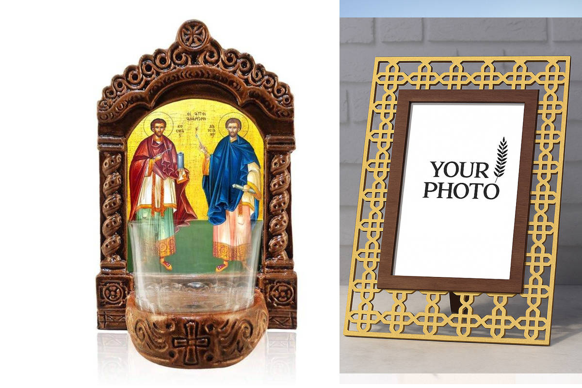 Εικόνα Ορθοδοξίας Πολυτελείας με σχεδιο Σταυρούς μαζι με Βάση σε 8 χρώματα με περίγραμμα χρυσό σε ξύλο Plywood (Πλακάζ) με βάση Οι Άγιοι Ανεργοφόροι Κοσμάς και Δαμιανός Λυχνία, Άγιοι Κοσμάς και Δαμιανός Κεραμική επιτραπέζια εικόνα, Άγιοι Ανάργυροι Αγρυπνία με Κύπελλο Διάσταση 10x7 cm (3,9 x 2,8 ίντσες) INTRAEK3kadro3211-816724125