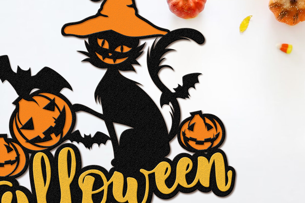 Intra απο ξύλο plywood 3mm-4mm πάχος Μαύρη γάτα με καπέλο Halloween ντεκόρ Δίασταση 15x15 cm INTRAFABR-104132200