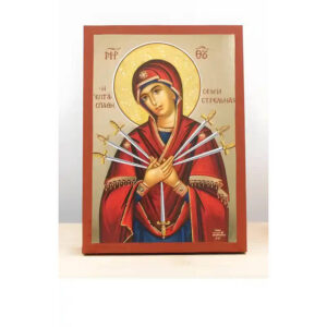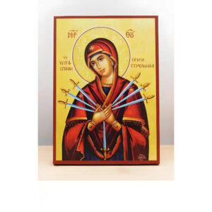 Εικόνα Ορθοδοξίας με περίγραμμα χρυσό σε ξύλο Φλαμουρίας με βάση Παναγία των Θλίψεων «Μαλακτικό των Καρδιών» Επταξίφη, Ξύλινη Χειροποίητη Εικόνα με Ψηφιακή Εκτύπωση Ελληνικού Βυζαντινού Στυλ τοίχου Χειροποίητη Ελληνορθόδοξη εικόνα του Ιησού Χριστού, Κρεμαστή πλάκα βυζαντινής τέχνης, χριστιανική τέχνη 45x35 cm (17,7 x 13,8 ίντσες) INTRAEK-342111109