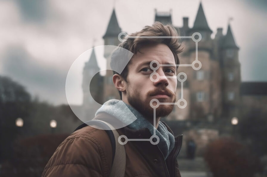Intra Συλλεκτικό Ξύλινο Παζλ Plywood 4mm - Άνδρας με καφέ σακάκι στέκεται μπροστά από ένα σκοτεινό κάστρο με ψηλούς πύργους Σε Ξύλινο Κουτί - Διαστάσεις Puzzle: 10x10 cm – 25 κομμάτια
