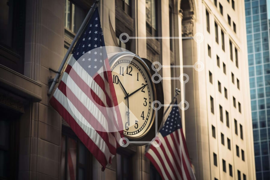 Intra Συλλεκτικό Ξύλινο Παζλ Plywood 4mm - Ρολόι που κρέμεται από αμερικανική σημαία και κτίρια Σε Ξύλινο Κουτί - Διαστάσεις Puzzle: 10x10 cm – 25 κομμάτια