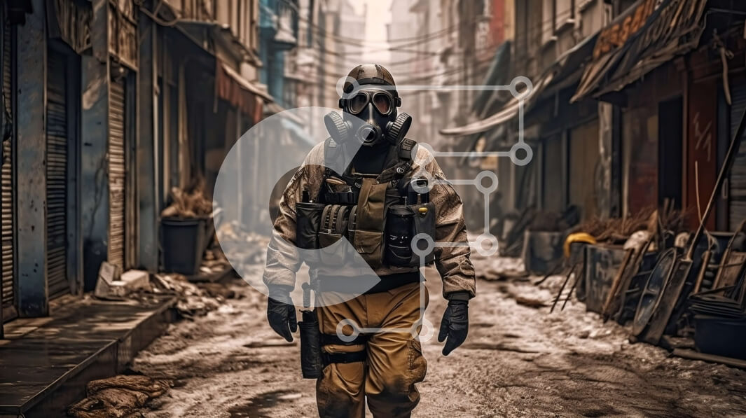 Intra Συλλεκτικό Ξύλινο Παζλ Plywood 4mm - Έρημο σοκάκι με άτομο με μάσκα αερίου και προστατευτική ενδυμασία Σε Ξύλινο Κουτί - Διαστάσεις Puzzle: 10x10 cm – 25 κομμάτια