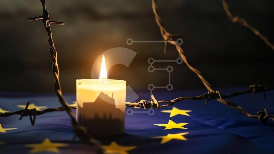 Intra Συλλεκτικό Ξύλινο Παζλ Plywood 4mm - Κερί σε συρματοπλέγματα μπροστά από τη σημαία της ΕΕ Σε Ξύλινο Κουτί - Διαστάσεις Puzzle: 10x10 cm – 25 κομμάτια
