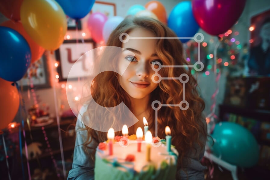 Intra Συλλεκτικό Ξύλινο Παζλ Plywood 4mm - Γιορτή για τα γενέθλια με μια νεαρή γυναίκα που κρατά μια τούρτα και πολύχρωμα μπαλόνια Σε Ξύλινο Κουτί - Διαστάσεις Puzzle: 10x10 cm – 25 κομμάτια