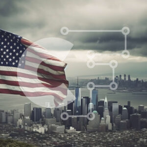 Intra Συλλεκτικό Ξύλινο Παζλ Plywood 4mm - Πατριωτική εικόνα της αμερικανικής σημαίας και του ορίζοντα της πόλης σε μια θυελλώδη ημέρα Σε Ξύλινο Κουτί - Διαστάσεις Puzzle: 10x10 cm – 25 κομμάτια