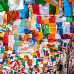 Intra Συλλεκτικό Ξύλινο Παζλ Plywood 4mm - Πολύχρωμες σημαίες που κρέμονται από κτίρια στην ευρωπαϊκή πόλη Σε Ξύλινο Κουτί - Διαστάσεις Puzzle: 10x10 cm – 25 κομμάτια