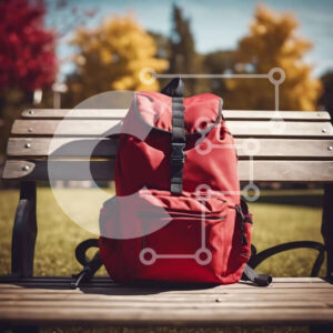 Intra Συλλεκτικό Ξύλινο Παζλ Plywood 4mm - Κόκκινο σακίδιο πλάτης σε ξύλινο πάγκο στο πάρκο Σε Ξύλινο Κουτί - Διαστάσεις Puzzle: 10x10 cm – 25 κομμάτια