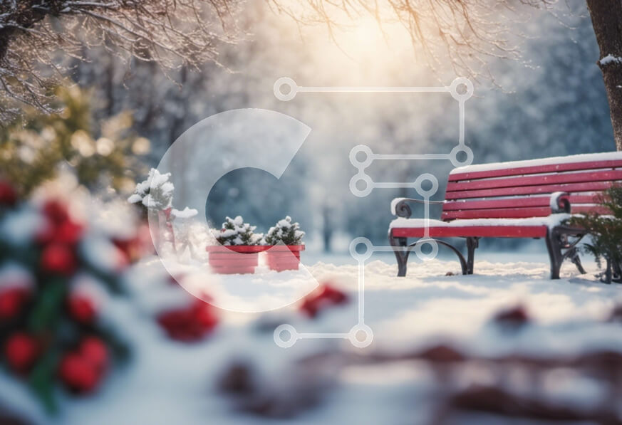 Intra Συλλεκτικό Ξύλινο Παζλ Plywood 4mm - Κόκκινος πάγκος στο Snowy Park με φυτά σε γλάστρες και χριστουγεννιάτικες διακοσμήσεις Σε Ξύλινο Κουτί - Διαστάσεις Puzzle: 10x10 cm – 25 κομμάτια