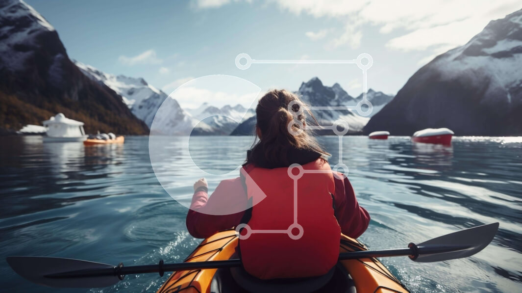 Intra Συλλεκτικό Ξύλινο Παζλ Plywood 4mm - Γυναίκα που κάνει καγιάκ κοντά σε βουνά και χιονισμένα τοπία Σε Ξύλινο Κουτί - Διαστάσεις Puzzle: 10x10 cm – 25 κομμάτια