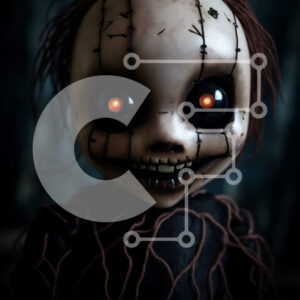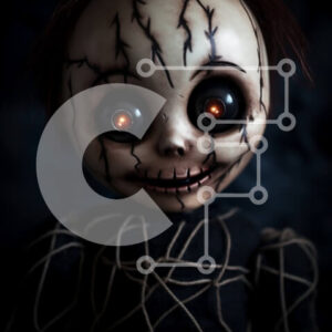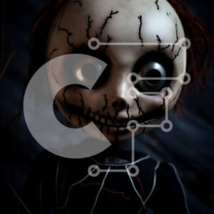 Intra Συλλεκτικό Ξύλινο Παζλ Plywood 4mm - Ανατριχιαστική κούκλα με κόκκινα μάτια σε σκούρο φόντο Σε Ξύλινο Κουτί - Διαστάσεις Puzzle: 10x10 cm – 25 κομμάτια