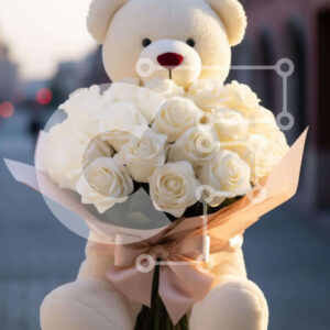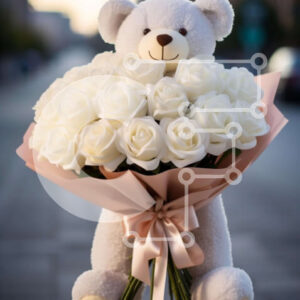 Intra Συλλεκτικό Ξύλινο Παζλ Plywood 4mm - Αξιολάτρευτο λευκό αρκουδάκι που κρατά ένα μπουκέτο με λευκά τριαντάφυλλα Σε Ξύλινο Κουτί - Διαστάσεις Puzzle: 10x10 cm – 25 κομμάτια
