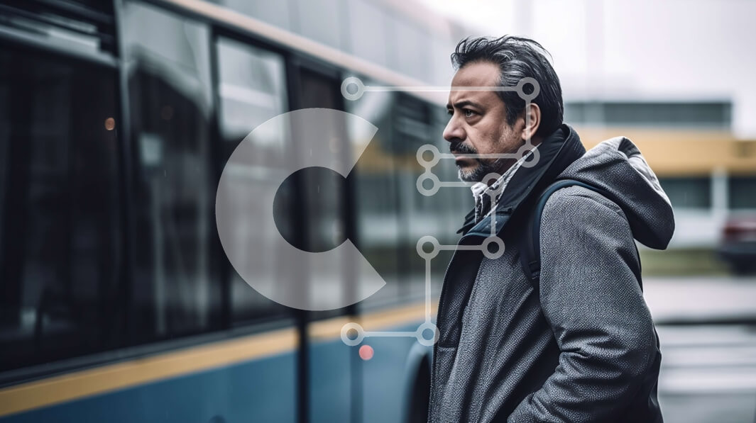 Intra Συλλεκτικό Ξύλινο Παζλ Plywood 4mm - Άνδρας με γκρι παλτό και καπέλο περιμένει στη στάση του αστικού λεωφορείου με μπλε λεωφορείο στο φόντο Σε Ξύλινο Κουτί - Διαστάσεις Puzzle: 10x10 cm – 25 κομμάτια